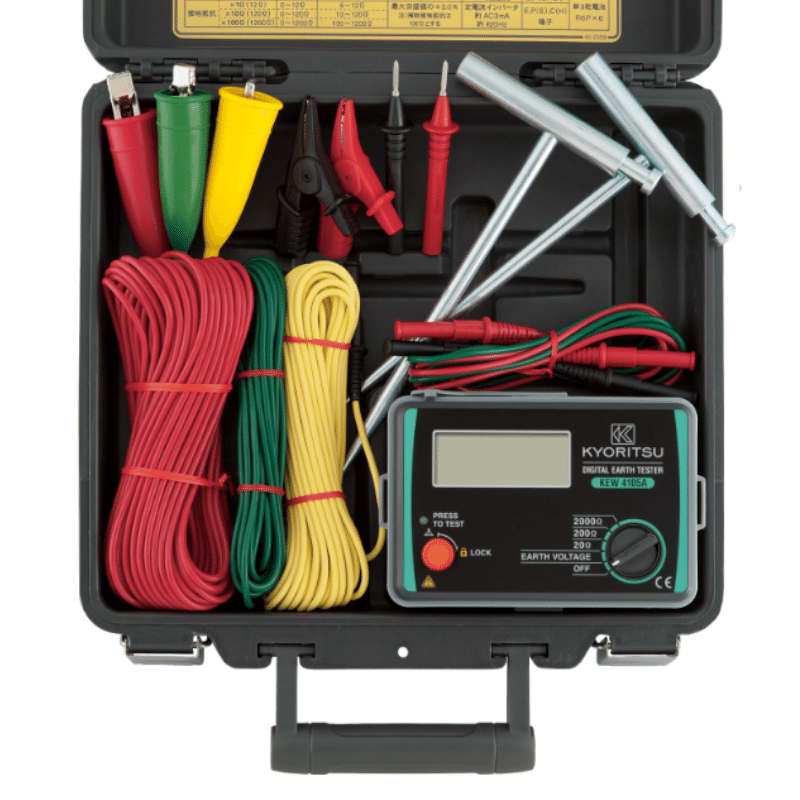 Đồng hồ đo điện trở đất KYORTISU 4105AH được trang bị 3 thang đo điện trở đất là 20Ω, 200Ω, 2000Ω phù hợp cho nhiều nhu cầu đo đa dạng khác nhau bên cạnh nhu cầu đo điện trở đất. Bên cạnh đó, sản phẩm còn được tích hợp tính năng đo điện áp đất, vốn là chỉ số vô cùng quan trọng cần phải kiểm tra trước khi muốn đo chính xác điện trở đất. Ngoài ra, máy đo điện trở tiếp đất KYORITSU 4105AH còn được nhà sản xuất trang bị đầy đủ bộ phụ kiện bao gồm bao da, cọc cắm, bộ 3 dây đo, pin để anh em có thể sẵn sàng thao tác đo ngay lập tức mà không gặp phải bất cứ trở ngại nào khác.